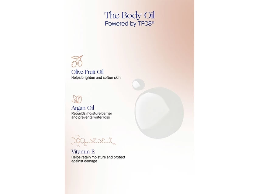 This body oil visibly smooths, firms and balances skin. It reduces the appearance of cellulite and stretch marks while hydrating with botanicals like olive oil. Patented TFC8 delivers key ingredients where they’re needed for maximum impact.