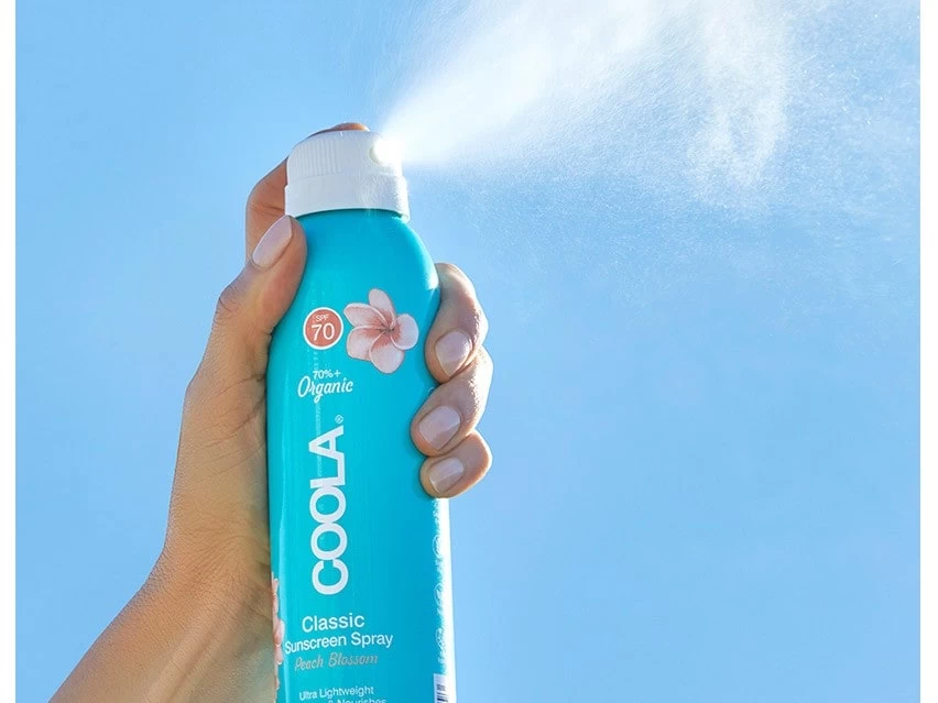 COOLA Organic Classic Body Sunscreen Spray SPF 70 – Peach Blossom protects skin from sunburn.