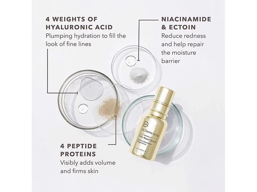 Dr. Dennis Gross Skincare DermInfusions Fill + Repair Serum mimics the results of injectable filler to plump and repair skin.