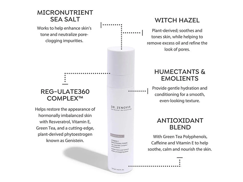 Dr. Zenovia Skincare Vitamin C Brightening Toner protects and hydrates skin, improving uneven tone and texture.