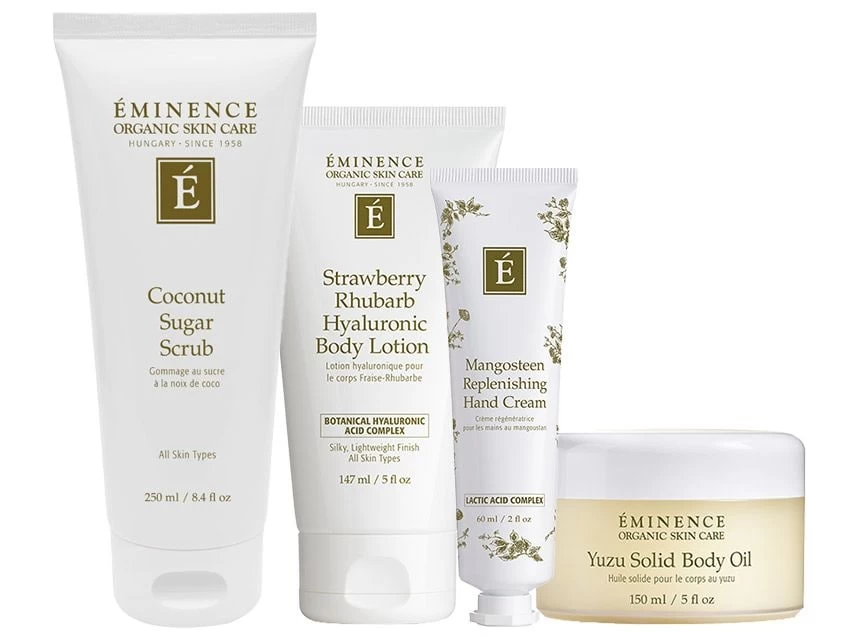 An in-shower must-have, the Coconut Sugar Scrub gently buffs skin to eliminate dry patches. The deliciously fresh Strawberry Rhubarb Body Lotion smooths skin and provides long-lasting moisture with a unique Botanical Hyaluronic Acid Complex. The Mangosteen Replenishing Hand Cream brings rejuvenating hydration to your fingertips with antioxidant-rich botanicals and a Lactic Acid Complex. The transformative Yuzu Solid Body Oil to refine skin and lock in moisture with a nourishing boost.
