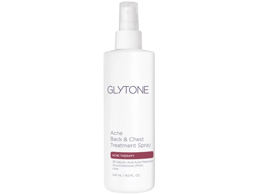 Glytone Acne Back & Chest Treatment Spray unclogs pores and heals existing blemishes on the body.