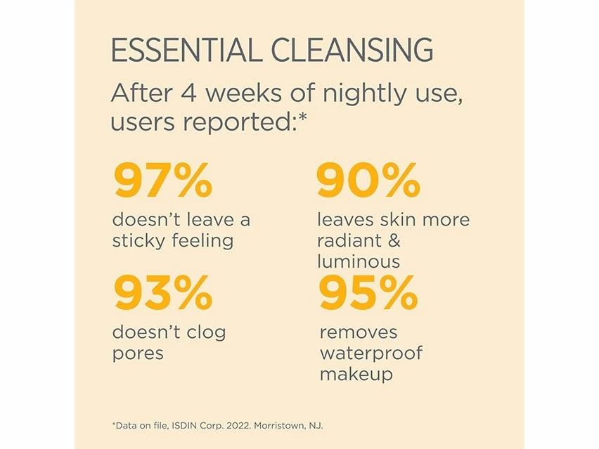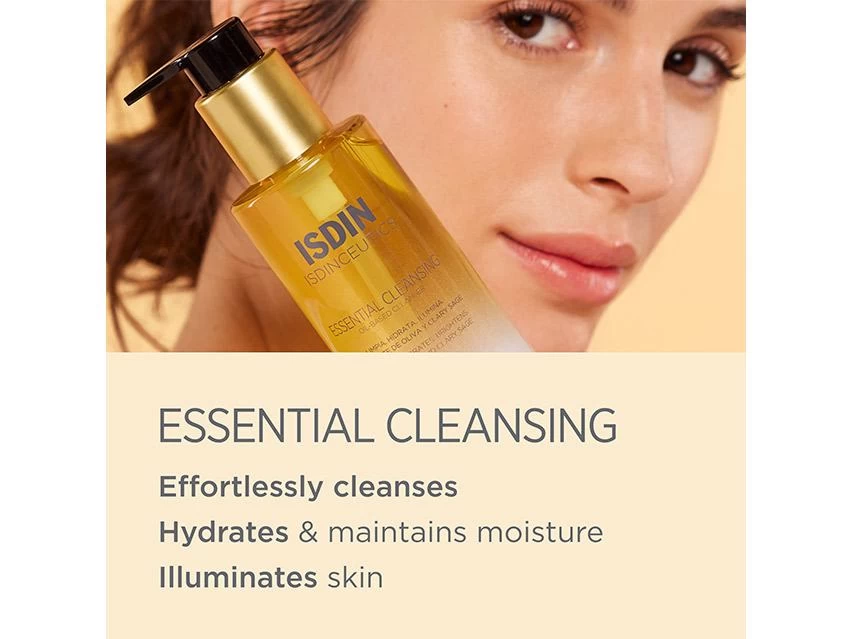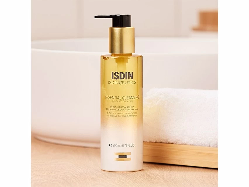ISDIN Isdinceutics Essential Cleansing Oil-Based Makeup Remover & Hydrating Cleanser leaves skin looking clean and glowing.