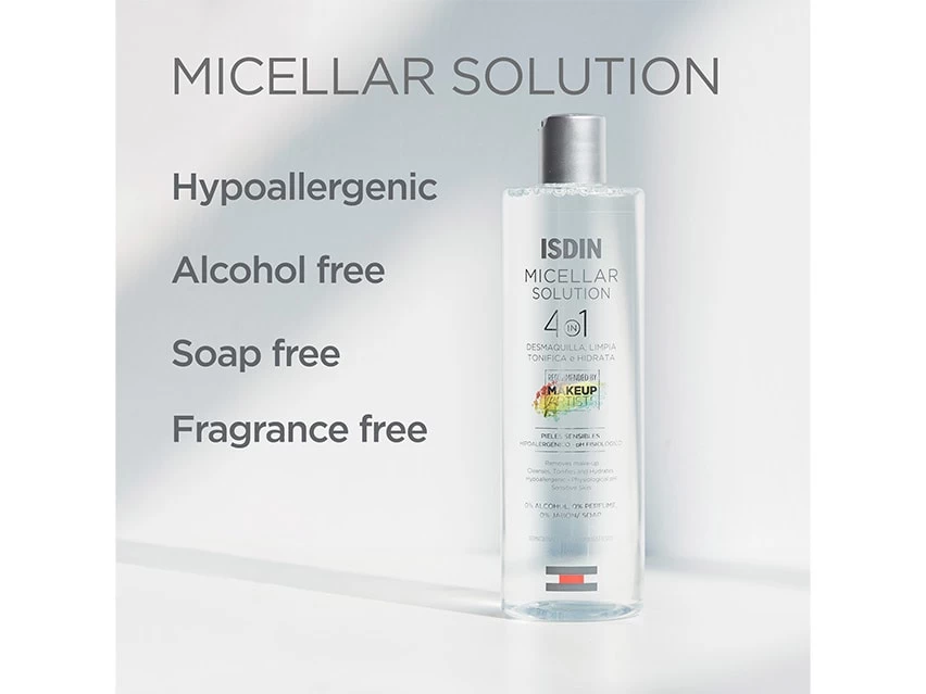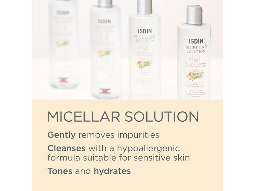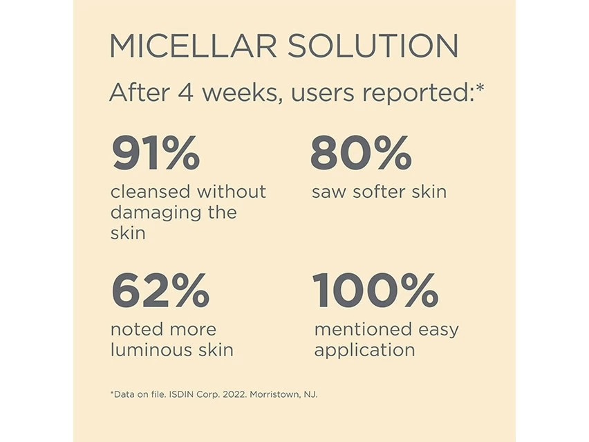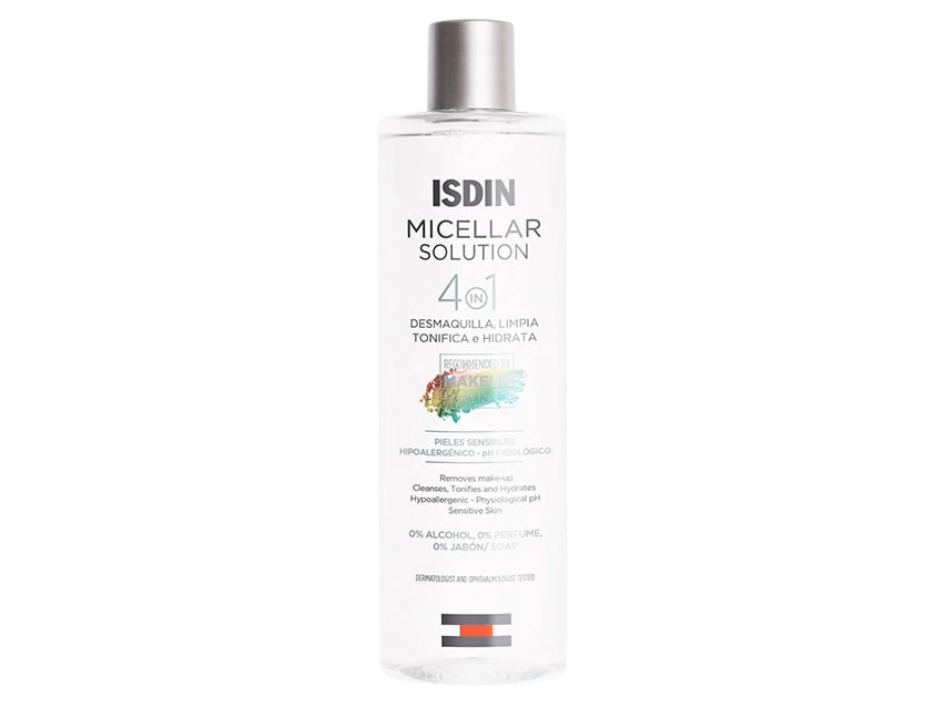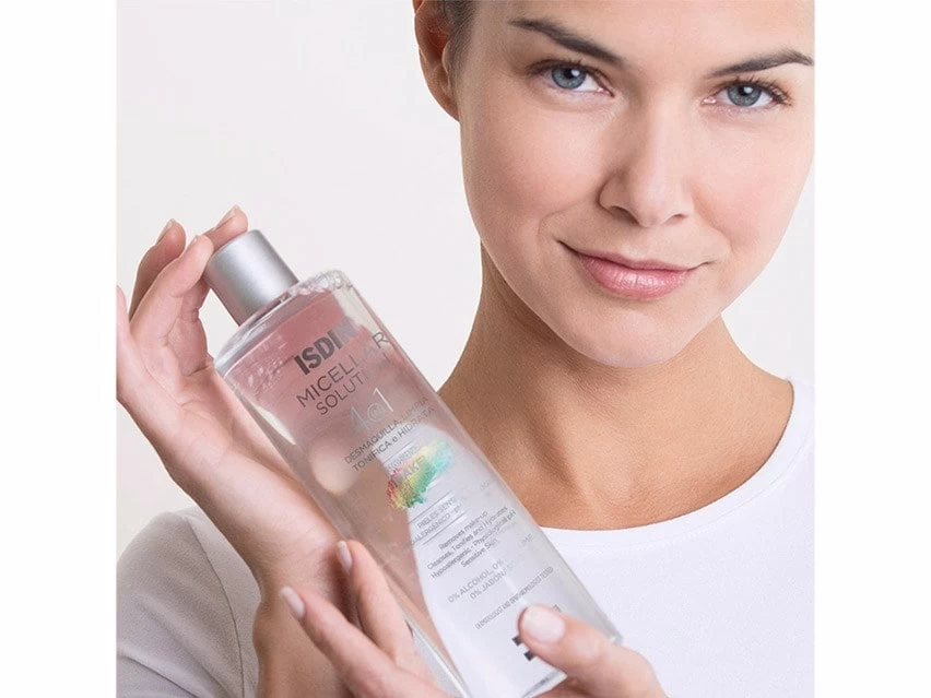 ISDIN Micellar Solution 4-in-1 Makeup Removing Micellar Cleansing Water leaves skin feeling clean and hydrated.