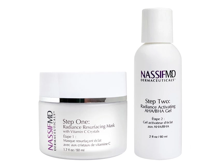 Inspired by the professional skin-resurfacing treatments in Dr. Nassif’s medical spas, this two-step peel brightens skin for a renewed glow. The first step is a Radiance Resurfacing Mask with vitamin C crystals to manually exfoliate and slough away dead skin cells. Next, the Radiance Activating AHA/BHA Gel uses a combination of lactic, salicylic and mandelic acid to further purify pores and dissolve the dead skin cells that can dull skin.