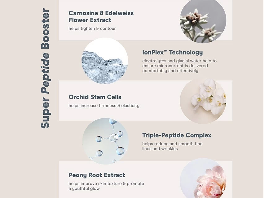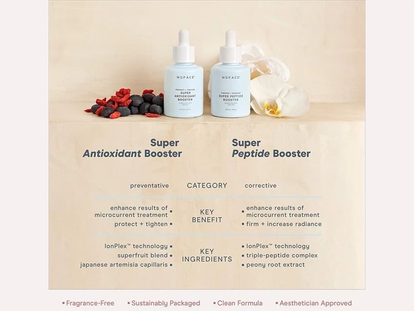 NuFACE Firming + Radiant Super Peptide Booster Serum supports a radiant and contoured appearance.