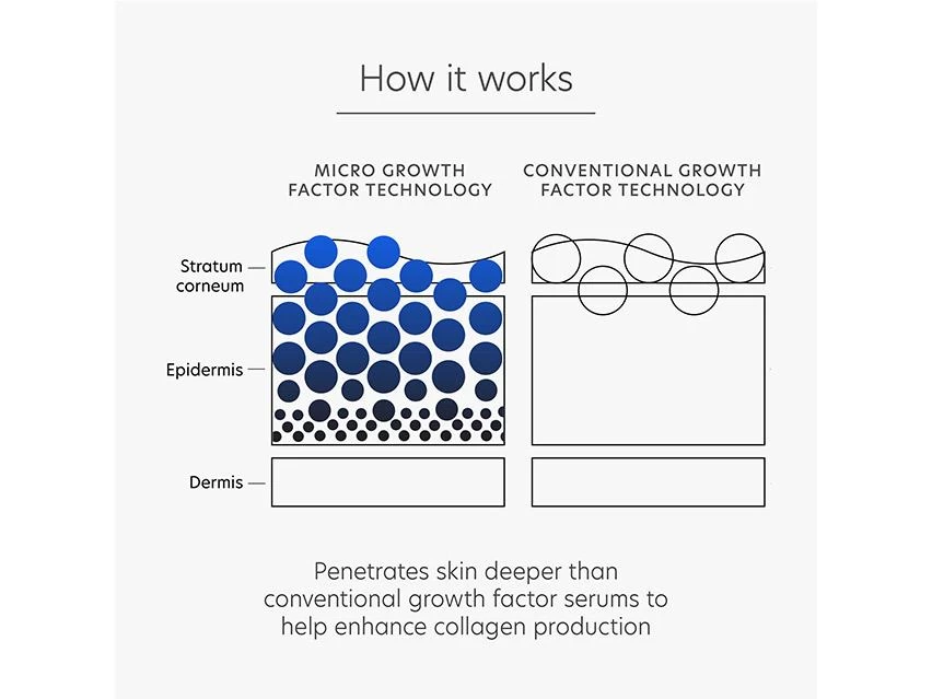 This serum is a professional approach to maximum age renewal. It firms the look of your skin with patent-pending Micro Growth Factor Technology. This technology penetrates deeper than traditional growth factors and boosts your skin’s production of collagen. As a result, your complexion looks smoother and has a greater appearance of fullness.