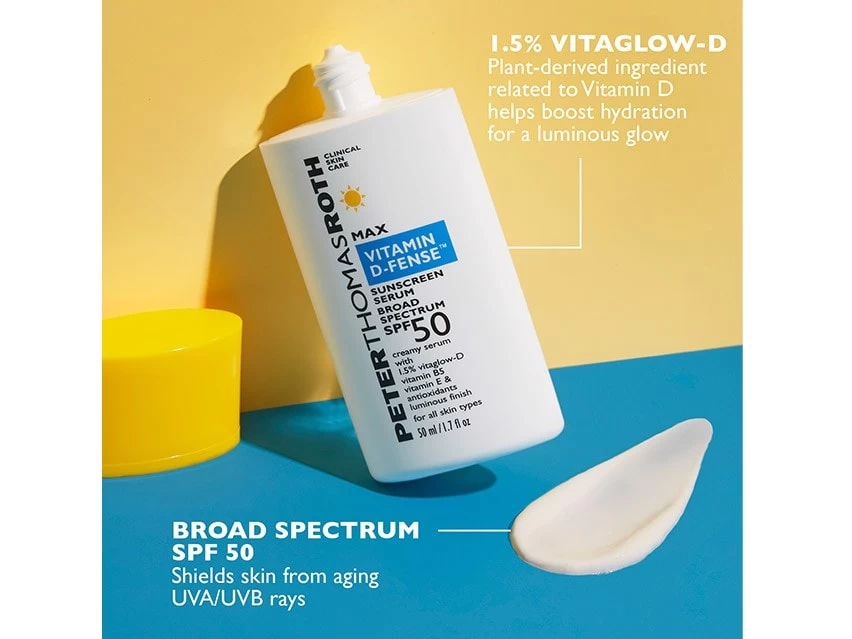 Peter Thomas Roth Max Vitamin D-Fense Sunscreen Serum Broad Spectrum SPF 50 offers hydration, antioxidant protection and sun defense.