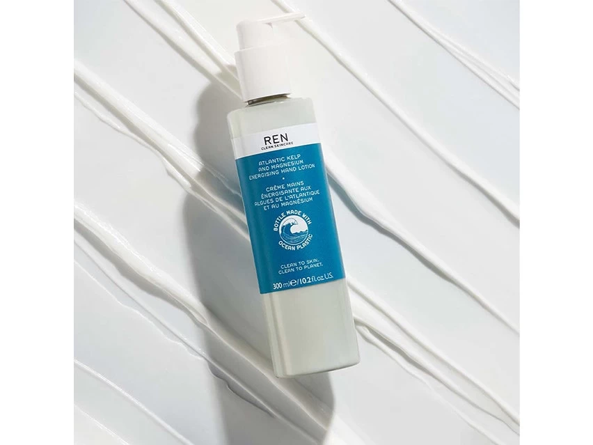 REN Clean Skincare Atlantic Kelp and Magnesium Energizing Hand Lotion nourishes and smooths dry hands.