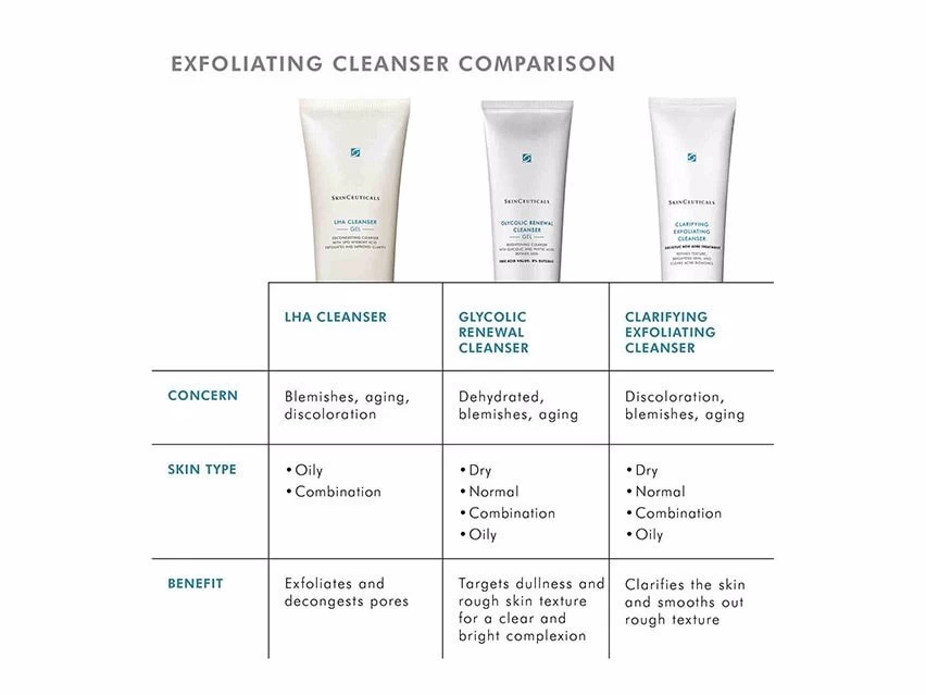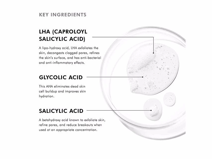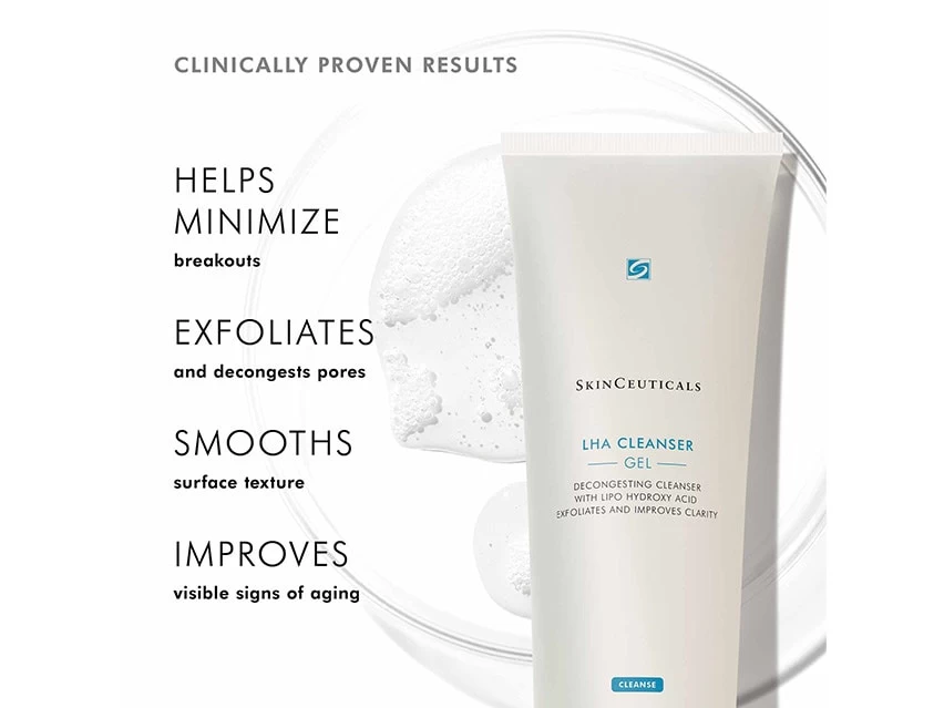 SkinCeuticals LHA Exfoliating Cleanser Gel contains lipo-hydroxy acid and salicylic acid to exfoliate and improve skin clarity. This exfoliating cleanser for congested skin is formulated with a conditioning surfactant and a 12% concentration combining lipo-hydroxy acid, glycolic acid, salicylic acid, glycerin and sorbitol. These ingredients remove excess oil and makeup while unclogging pores and brightening skin.