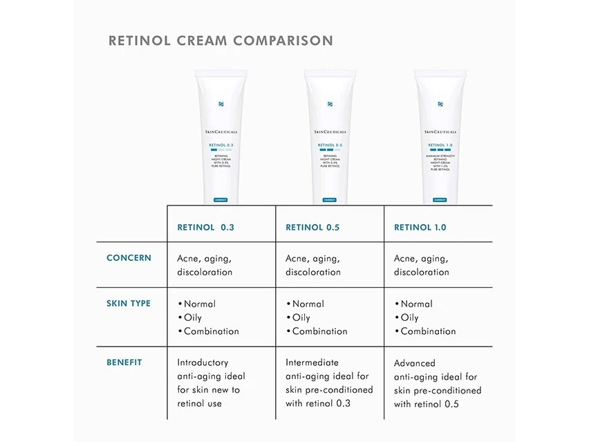 Ideal for skin that has been preconditioned with the use of SkinCeuticals Retinol 0.3, SkinCeuticals Retinol 0.5 targets and corrects the appearance of discoloration, wrinkles and pores. Topical retinols have been used by dermatologists to help combat and reverse the visual effects of aging. Retinols accelerate cell turnover and can minimize the appearance of blemishes and pores.