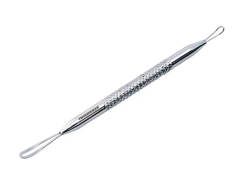 Dual-sided skin care tool for removal of whiteheads and blackheads. Featuring a thin angled loop to gently roll out mature whiteheads and a flat side to press out blackheads. Textured body provides added control. Stainless steel.